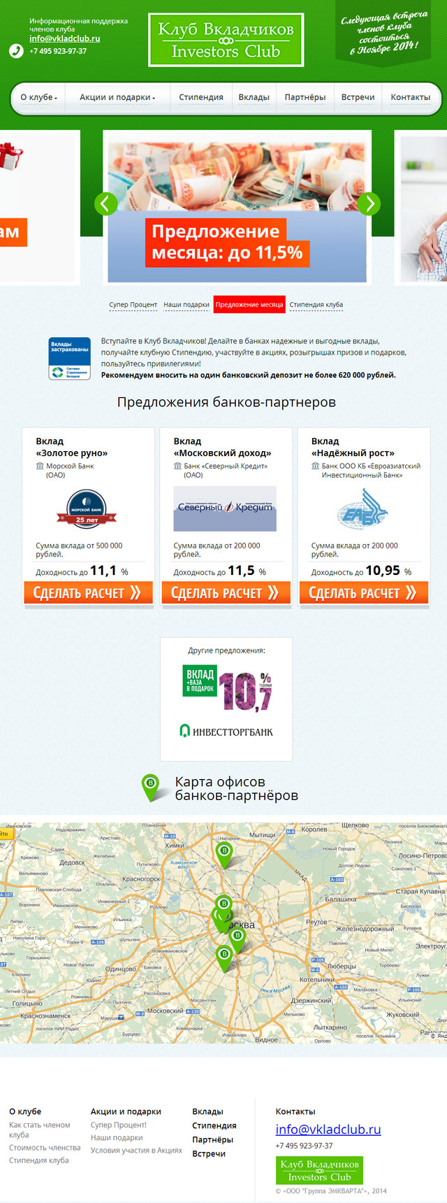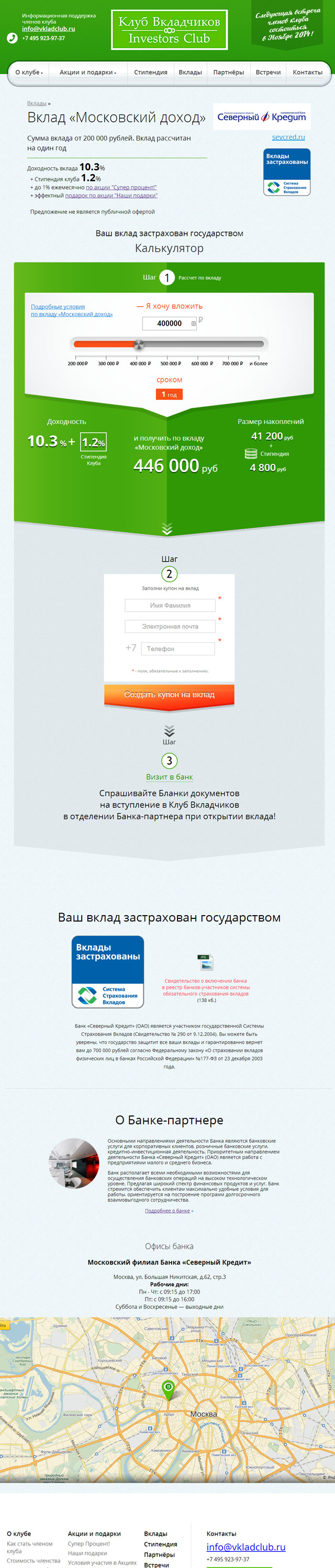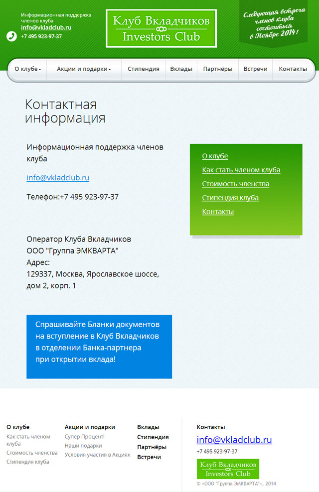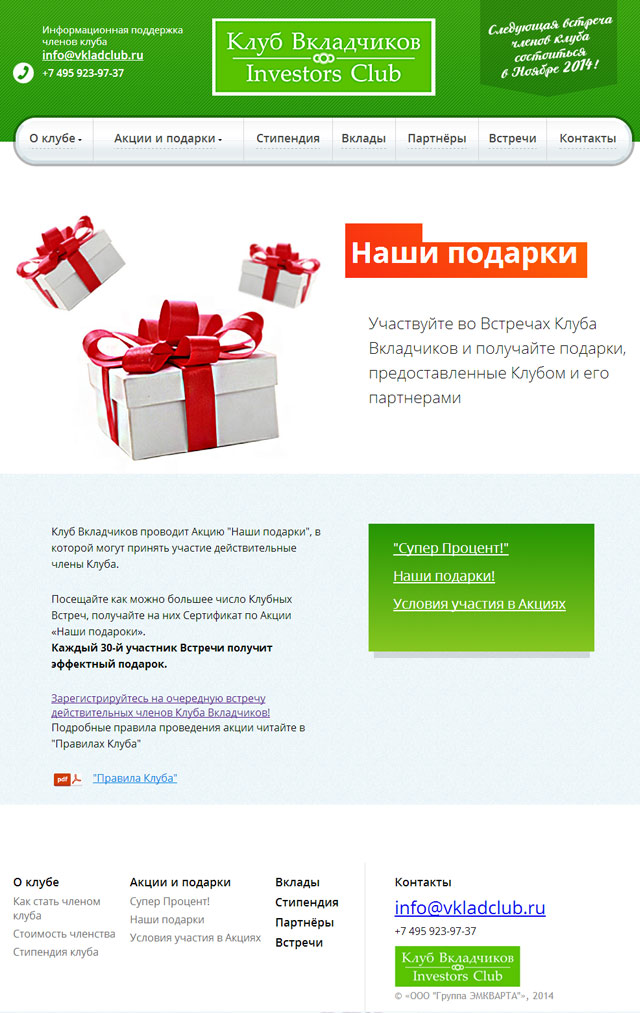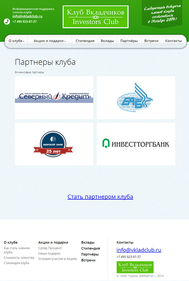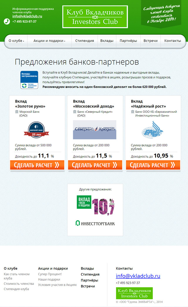 Для привлечения вкладчиков, инвесторов и партнеров, мы разработали сайт Клуба вкладчиков, рассказывающий о совместных акциях, условиях участия и предложениях партнеров.